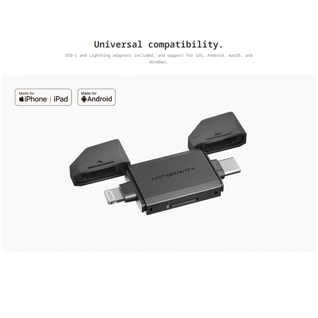 Plug and play. Seamlessly connects to smartphones for instant export and editing, streamlining your workflow. Edit footage without powering on the drone. Powered by USB 3.0 for high-speed, low-latency transfers. USB-C and Lightning adapters included, and support for iOS, Android, macOS, and Windows.