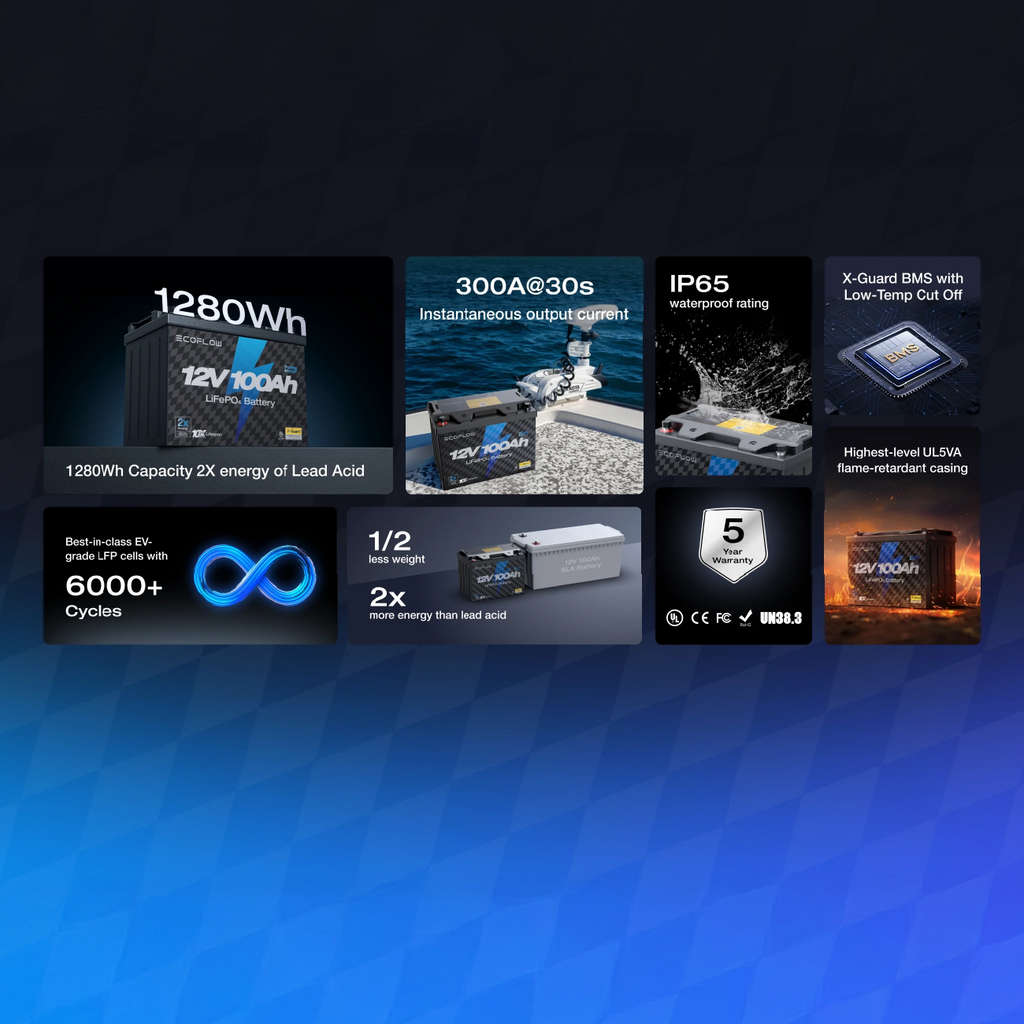 Reliable, long-lasting power in a lightweight and compact design. The EcoFlow 12V 100Ah Lithium Battery delivers 1280Wh of stable energy using EV-grade LiFePO₄ cells, making it ideal for RVs, solar systems, marine use, and home backup.