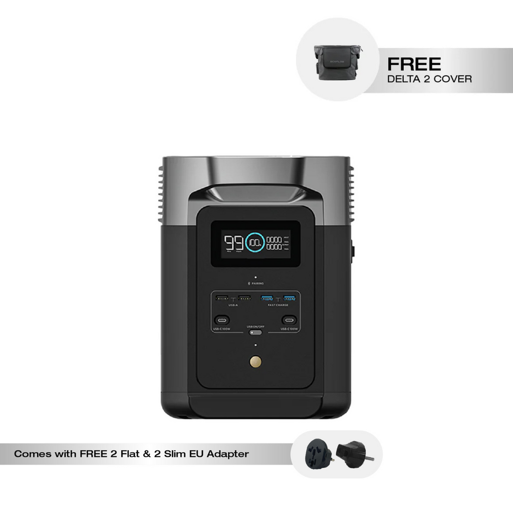 The EcoFlow DELTA 2 Portable Power Station is a versatile energy solution with a durable 1024Wh LiFePO₄ battery (expandable up to 3040Wh), delivering 1800W output (2700W peak) through multiple AC, USB, and DC ports. It charges rapidly—0–80% in 50 minutes via AC—and supports solar (up to 500W), car, and generator charging. Weighing 12 kg and featuring Wi-Fi and Bluetooth for app control, it’s perfect for both everyday and emergency power needs.