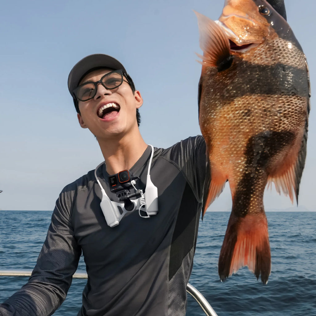 Neck mount that doubles as a power bank for continuous first-person shots, hands-free. Built-in 4800mAh battery charges the camera while filming. Never miss a moment with continuous recording in Pre-Recording Mode. Use as a standalone mount or combine it with the Helmet Chin Mount 2.0, Chest Strap or X5 POV Chest Mount. Includes a removable Neck Guard for comfort during long shoots.