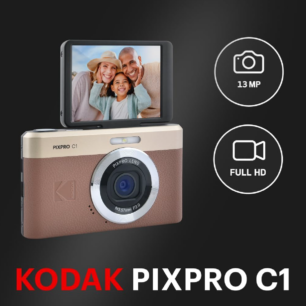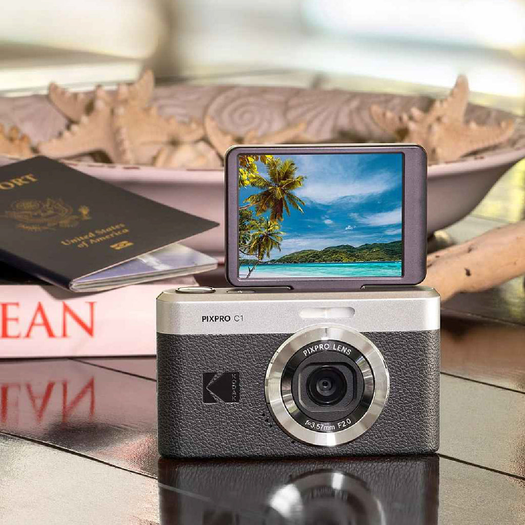 The PIXPRO C1 Compact Digital Camera from Kodak is a vintage-style point-and-shoot fixed lens with capable modern internal hardware. Between the 26mm f/2 fixed focus wide-angle lens and the 13 MP 1/3" BSI CMOS sensor, it's simple to make crisp, colorful photos in a variety of lighting situations. The camera has a built-in flash and an 2.8" LCD screen that tilts 180° for taking selfies or shooting from any angle. It captures video, recording scenes in 30 or 60 fps at 1920 x 1080 Full HD. Recharge the internal battery with the included USB-C cable, so you're always ready for spontaneous shoots.