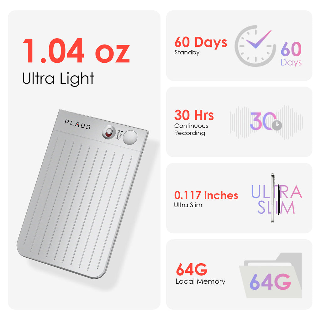 - 30-hour continuous recording, 60 days standby, 64GB storage.