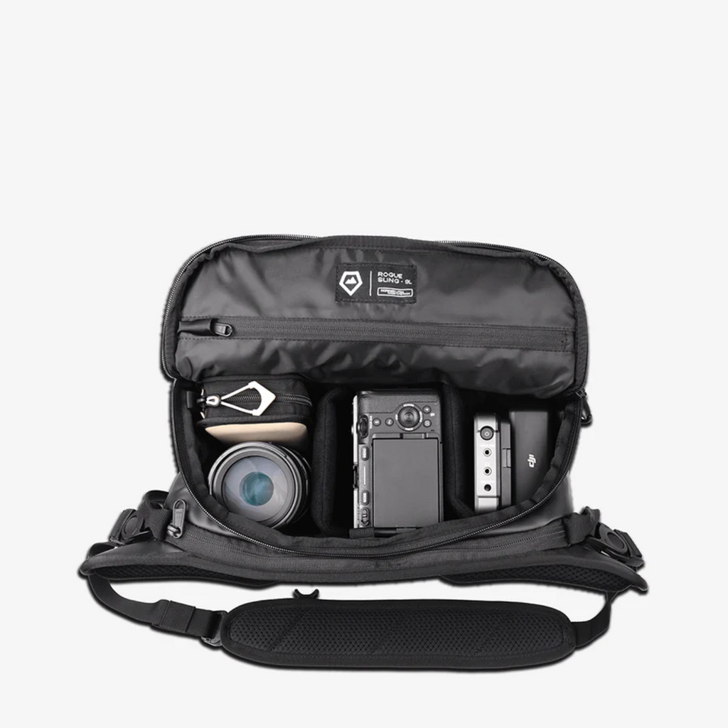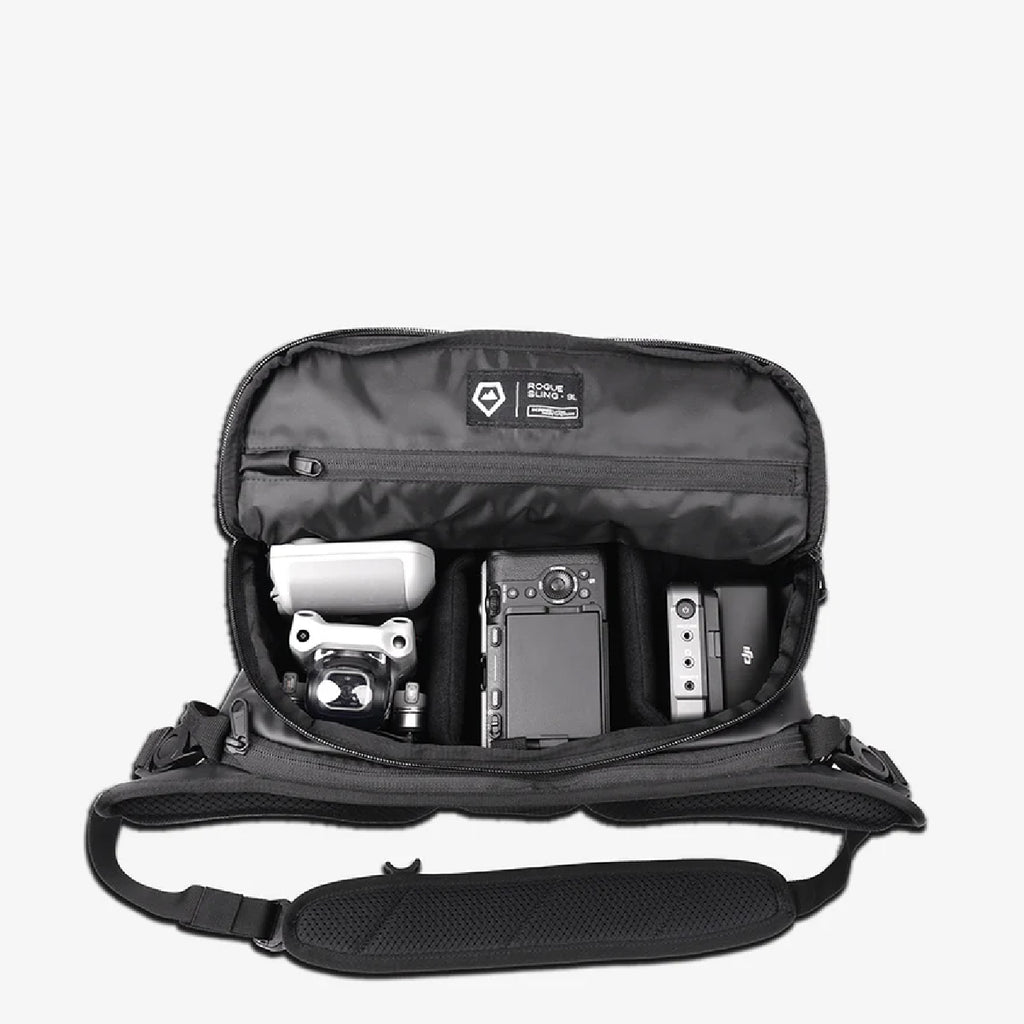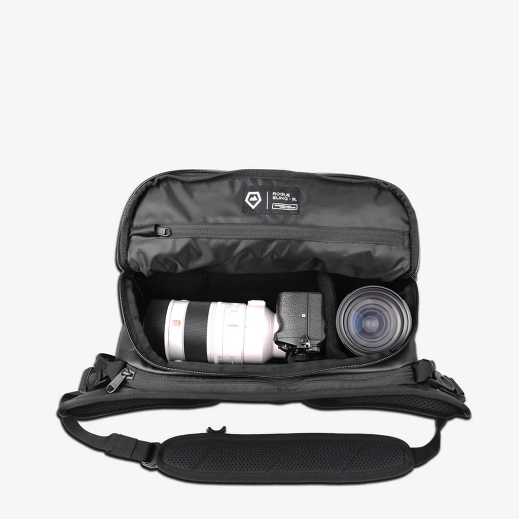 The 9L ROGUE Sling Bag is a compact, versatile, and weather-resistant camera and everyday bag with customizable storage, laptop carry, and multiple carrying options.